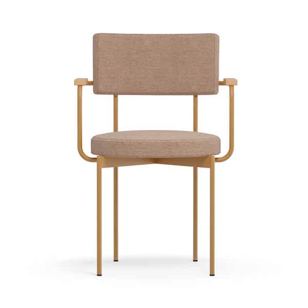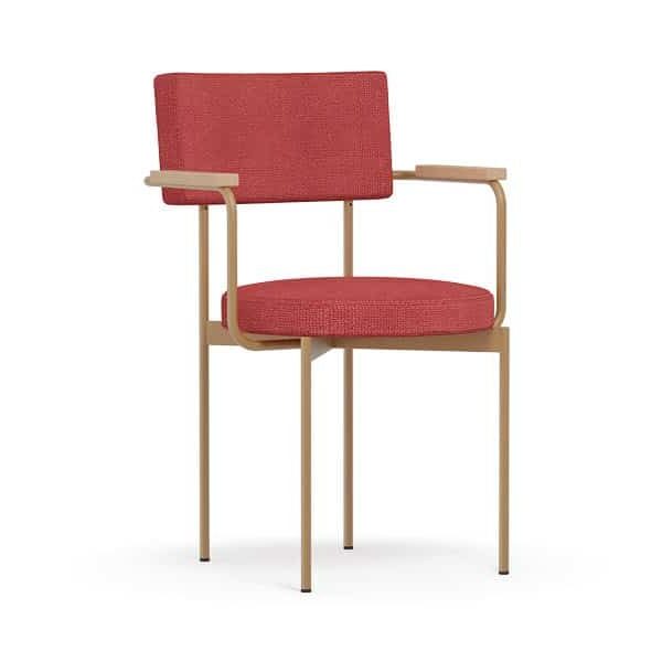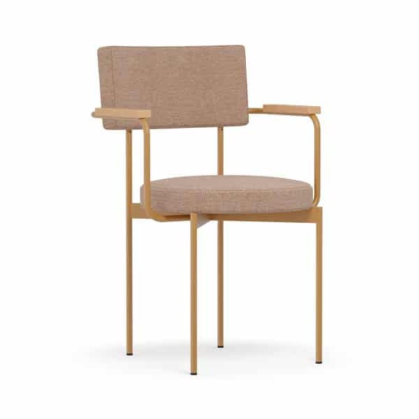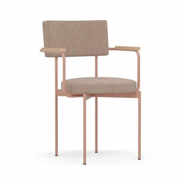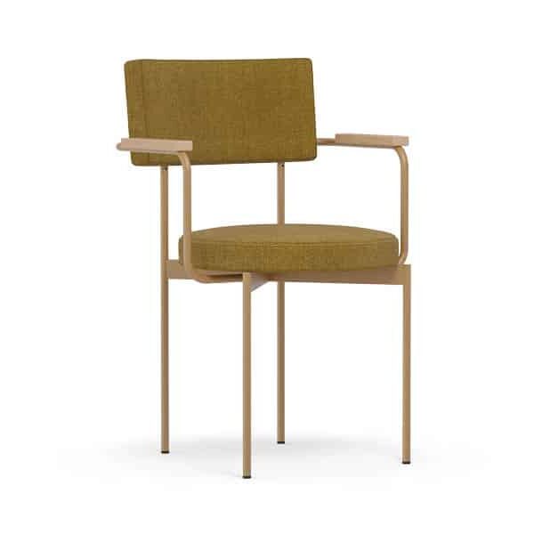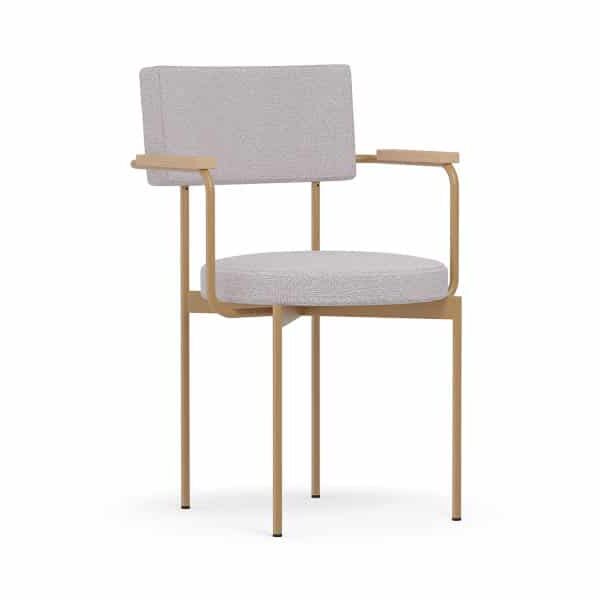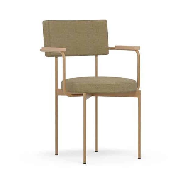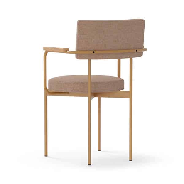 Armstoel Dina heeft een opvallend en uniek design met rechte en ronde vormen. Het stalen frame bestaat uit ronde buizen, met als armleuningen eiken houten armleggers. De zitting is rond en de rugleuning is rechthoekig. Door deze twee vormen is het een unieke stijl.